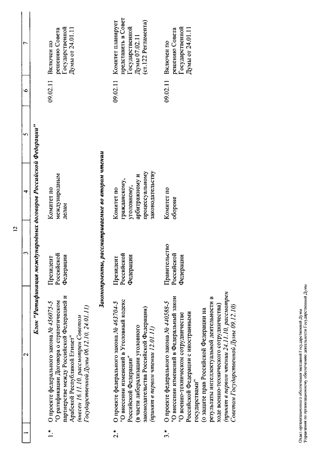 "О КАЛЕНДАРЕ РАССМОТРЕНИЯ ВОПРОСОВ ГОСУДАРСТВЕННОЙ ДУМОЙ С 8 ПО 25 ФЕВРАЛЯ 2011 ГОДА"