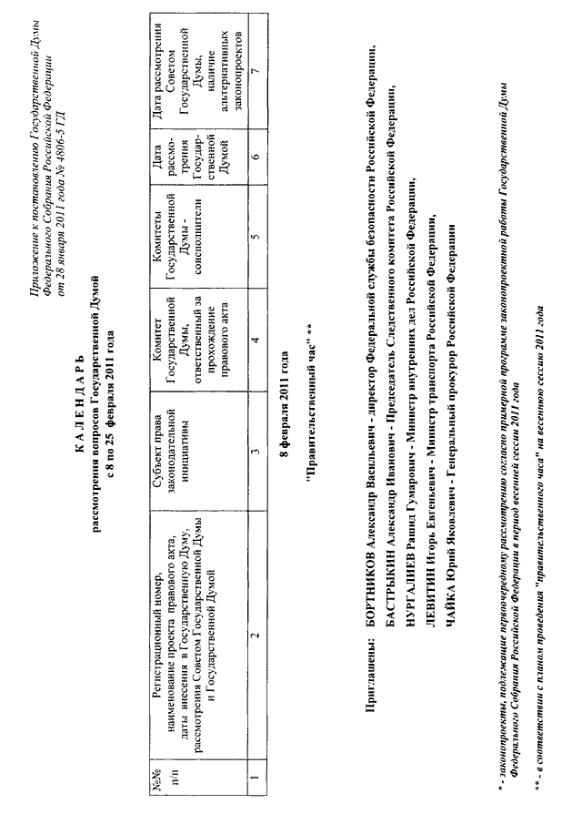 "О КАЛЕНДАРЕ РАССМОТРЕНИЯ ВОПРОСОВ ГОСУДАРСТВЕННОЙ ДУМОЙ С 8 ПО 25 ФЕВРАЛЯ 2011 ГОДА"