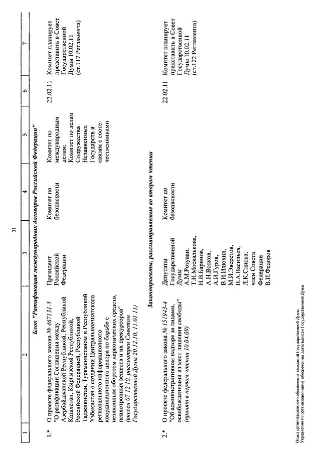 "О КАЛЕНДАРЕ РАССМОТРЕНИЯ ВОПРОСОВ ГОСУДАРСТВЕННОЙ ДУМОЙ С 8 ПО 25 ФЕВРАЛЯ 2011 ГОДА"
