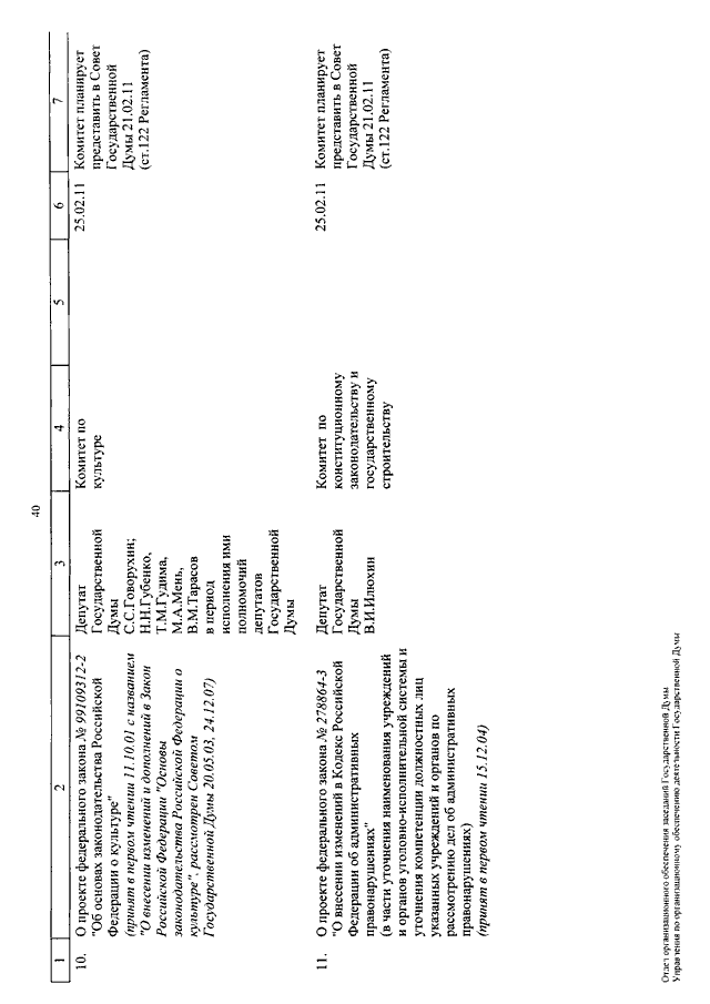 "О КАЛЕНДАРЕ РАССМОТРЕНИЯ ВОПРОСОВ ГОСУДАРСТВЕННОЙ ДУМОЙ С 8 ПО 25 ФЕВРАЛЯ 2011 ГОДА"