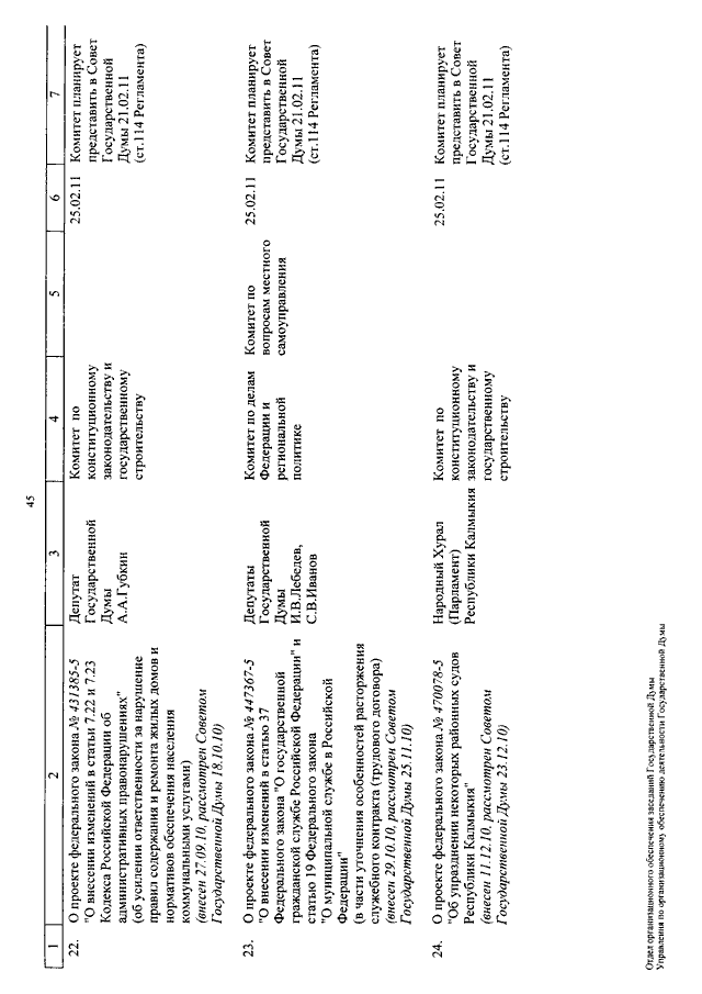 "О КАЛЕНДАРЕ РАССМОТРЕНИЯ ВОПРОСОВ ГОСУДАРСТВЕННОЙ ДУМОЙ С 8 ПО 25 ФЕВРАЛЯ 2011 ГОДА"