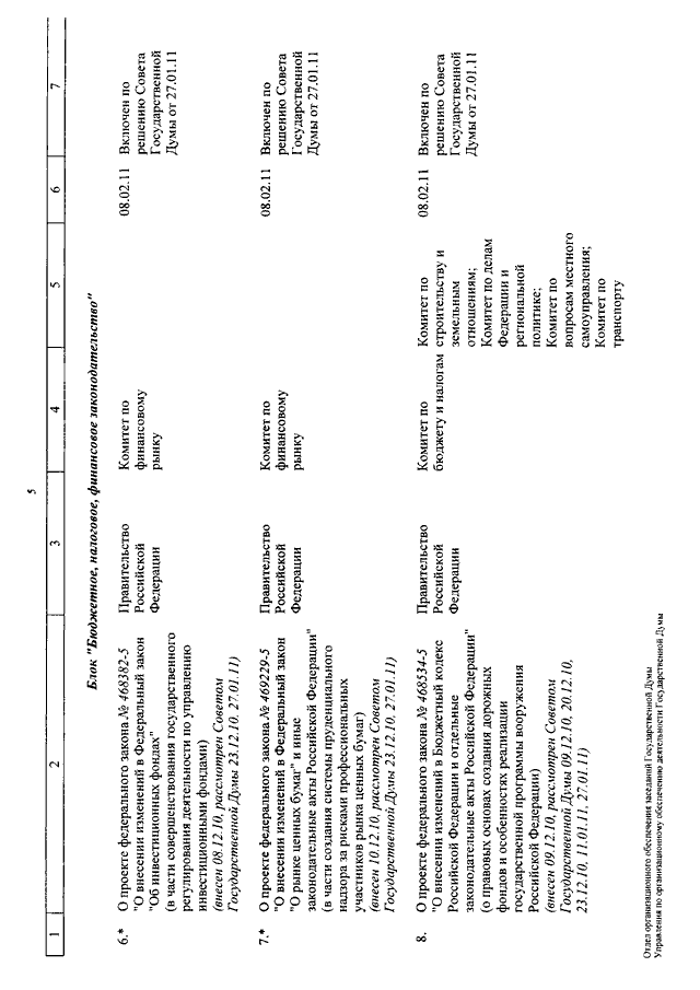 "О КАЛЕНДАРЕ РАССМОТРЕНИЯ ВОПРОСОВ ГОСУДАРСТВЕННОЙ ДУМОЙ С 8 ПО 25 ФЕВРАЛЯ 2011 ГОДА"