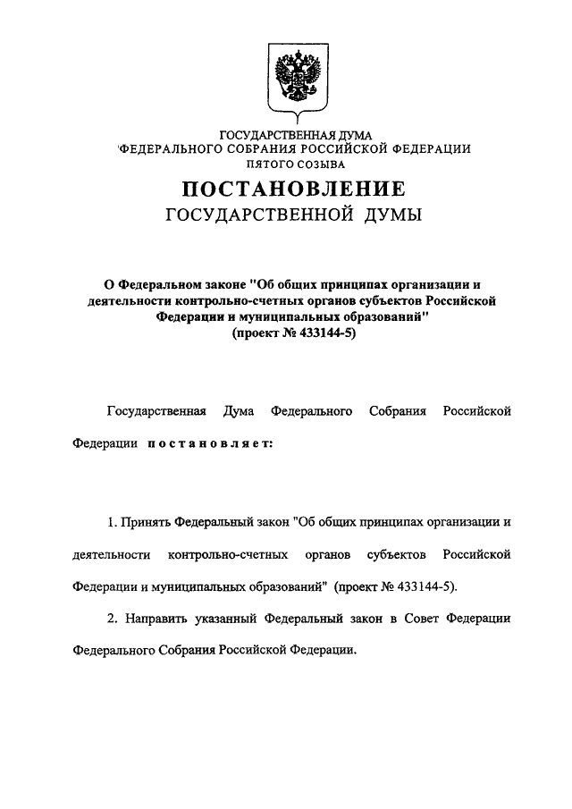 "О ФЕДЕРАЛЬНОМ ЗАКОНЕ "ОБ ОБЩИХ ПРИНЦИПАХ ОРГАНИЗАЦИИ И ДЕЯТЕЛЬНОСТИ КОНТРОЛЬНО - СЧЕТНЫХ ОРГАНОВ СУБЪЕКТОВ РОССИЙСКОЙ ФЕДЕРАЦИИ И МУНИЦИПАЛЬНЫХ ОБРАЗОВАНИЙ" (ПРОЕКТ N 433144-5)"