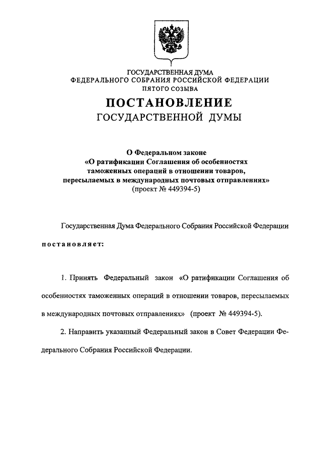 "О ФЕДЕРАЛЬНОМ ЗАКОНЕ "О РАТИФИКАЦИИ СОГЛАШЕНИЯ ОБ ОСОБЕННОСТЯХ ТАМОЖЕННЫХ ОПЕРАЦИЙ В ОТНОШЕНИИ ТОВАРОВ, ПЕРЕСЫЛАЕМЫХ В МЕЖДУНАРОДНЫХ ПОЧТОВЫХ ОТПРАВЛЕНИЯХ" (ПРОЕКТ N 449394-5)"