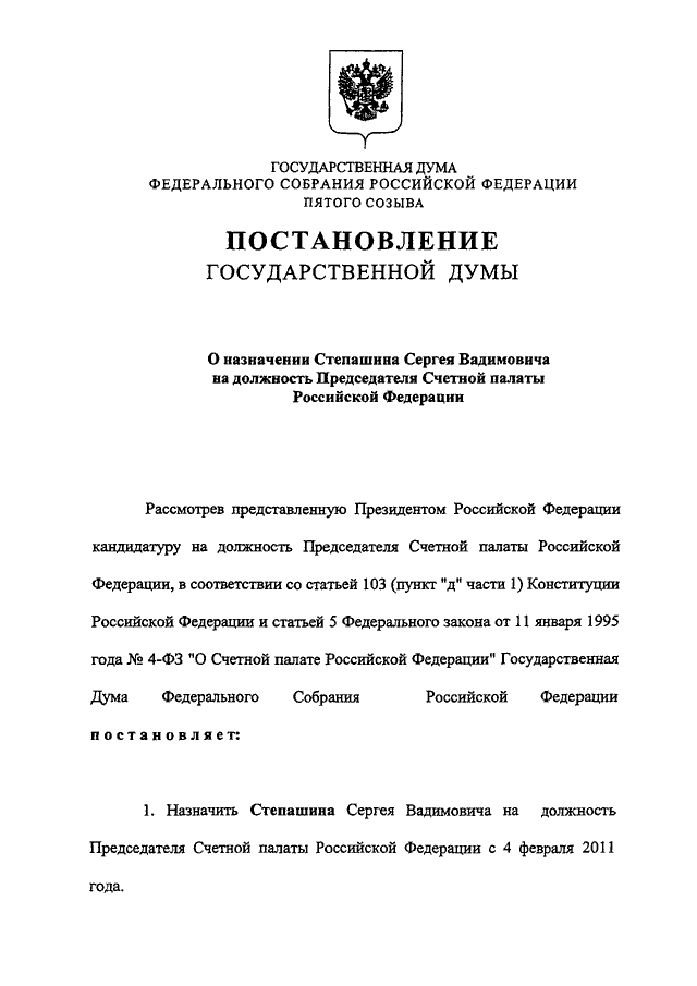 "О НАЗНАЧЕНИИ СТЕПАШИНА СЕРГЕЯ ВАДИМОВИЧА НА ДОЛЖНОСТЬ ПРЕДСЕДАТЕЛЯ СЧЕТНОЙ ПАЛАТЫ РОССИЙСКОЙ ФЕДЕРАЦИИ"