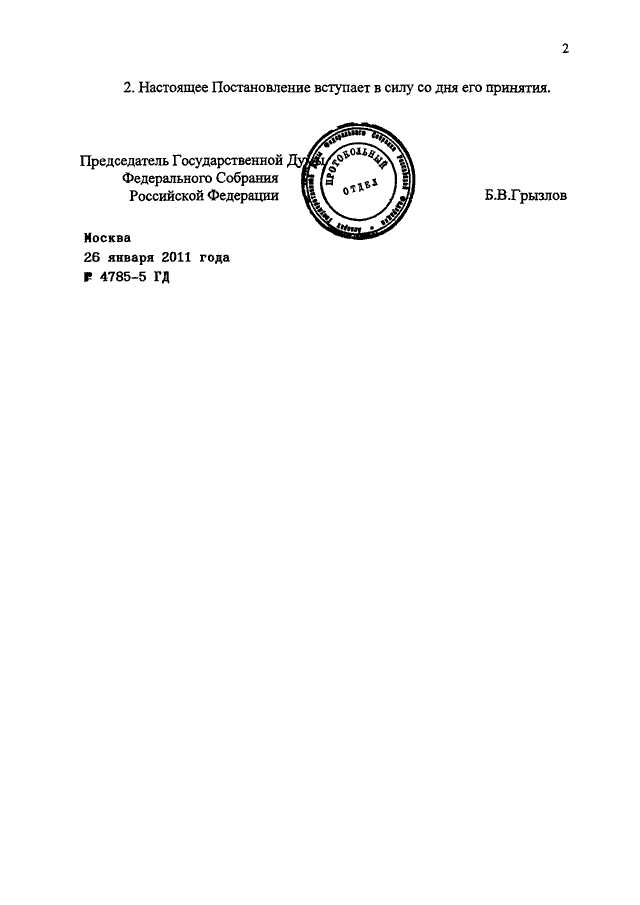ПОСТАНОВЛЕНИЕ ГД ФС РФ от 26.01.2011 N 4785-5 ГД