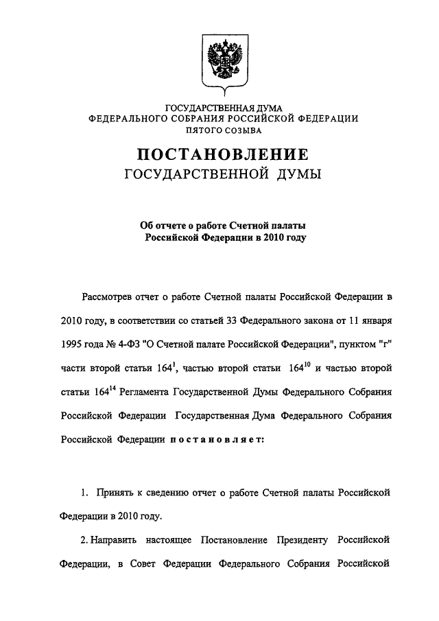 "ОБ ОТЧЕТЕ О РАБОТЕ СЧЕТНОЙ ПАЛАТЫ РОССИЙСКОЙ ФЕДЕРАЦИИ В 2010 ГОДУ"