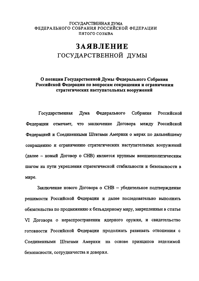 "О ЗАЯВЛЕНИИ ГОСУДАРСТВЕННОЙ ДУМЫ ФЕДЕРАЛЬНОГО СОБРАНИЯ РОССИЙСКОЙ ФЕДЕРАЦИИ "О ПОЗИЦИИ ГОСУДАРСТВЕННОЙ ДУМЫ ФЕДЕРАЛЬНОГО СОБРАНИЯ РОССИЙСКОЙ ФЕДЕРАЦИИ ПО ВОПРОСАМ СОКРАЩЕНИЯ И ОГРАНИЧЕНИЯ СТРАТЕГИЧЕСКИХ НАСТУПАТЕЛЬНЫХ ВООРУЖЕНИЙ"