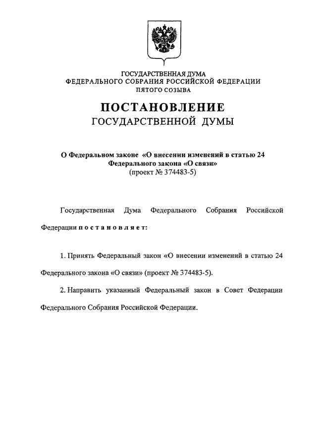 "О ФЕДЕРАЛЬНОМ ЗАКОНЕ "О ВНЕСЕНИИ ИЗМЕНЕНИЙ В СТАТЬЮ 24 ФЕДЕРАЛЬНОГО ЗАКОНА "О СВЯЗИ" (ПРОЕКТ N 374483-5)"