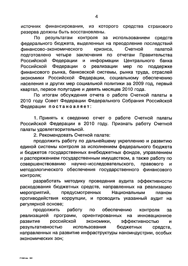"ОБ ОТЧЕТЕ О РАБОТЕ СЧЕТНОЙ ПАЛАТЫ РОССИЙСКОЙ ФЕДЕРАЦИИ В 2010 ГОДУ"