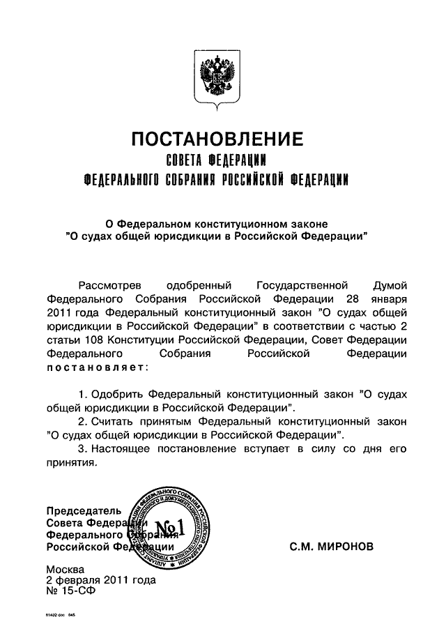 ПОСТАНОВЛЕНИЕ СФ ФС РФ от 02.02.2011 N 15-СФ