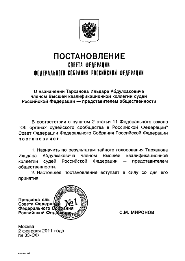 ПОСТАНОВЛЕНИЕ СФ ФС РФ от 02.02.2011 N 33-СФ