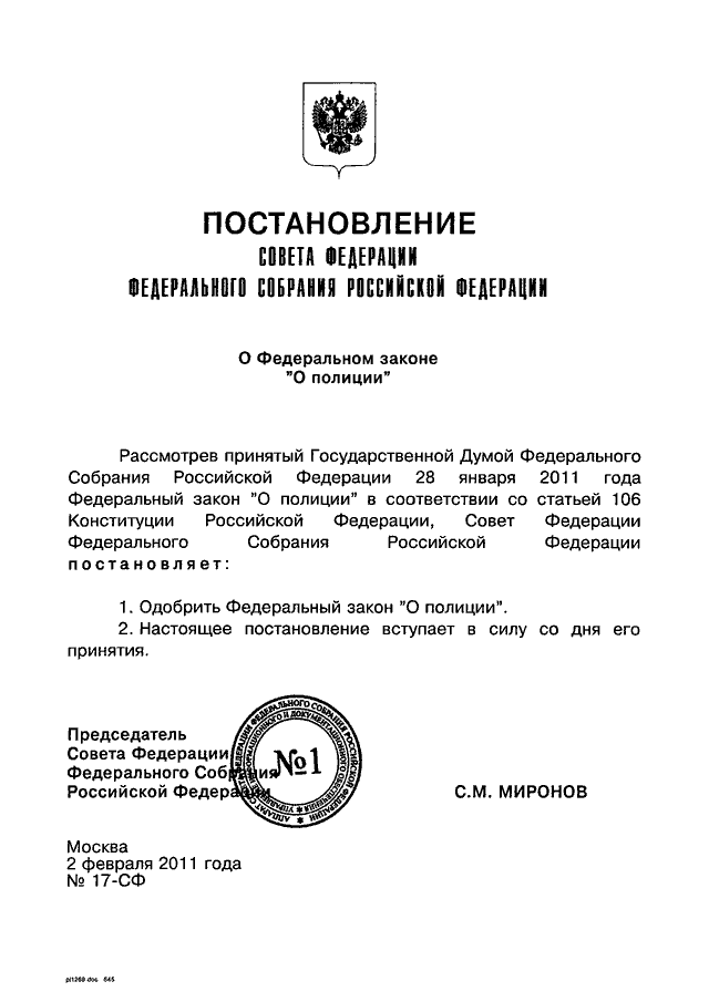 ПОСТАНОВЛЕНИЕ СФ ФС РФ от 02.02.2011 N 17-СФ
