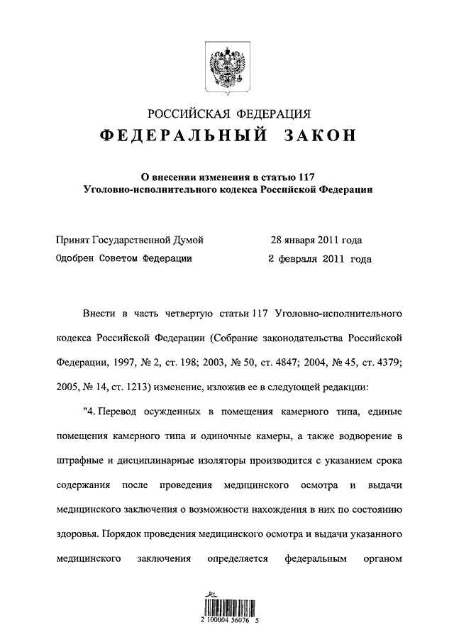 "О ВНЕСЕНИИ ИЗМЕНЕНИЯ В СТАТЬЮ 117 УГОЛОВНО - ИСПОЛНИТЕЛЬНОГО КОДЕКСА РОССИЙСКОЙ ФЕДЕРАЦИИ"