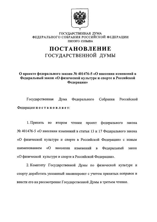 "О ПРОЕКТЕ ФЕДЕРАЛЬНОГО ЗАКОНА N 401476-5 "О ВНЕСЕНИИ ИЗМЕНЕНИЙ В ФЕДЕРАЛЬНЫЙ ЗАКОН "О ФИЗИЧЕСКОЙ КУЛЬТУРЕ И СПОРТЕ В РОССИЙСКОЙ ФЕДЕРАЦИИ"