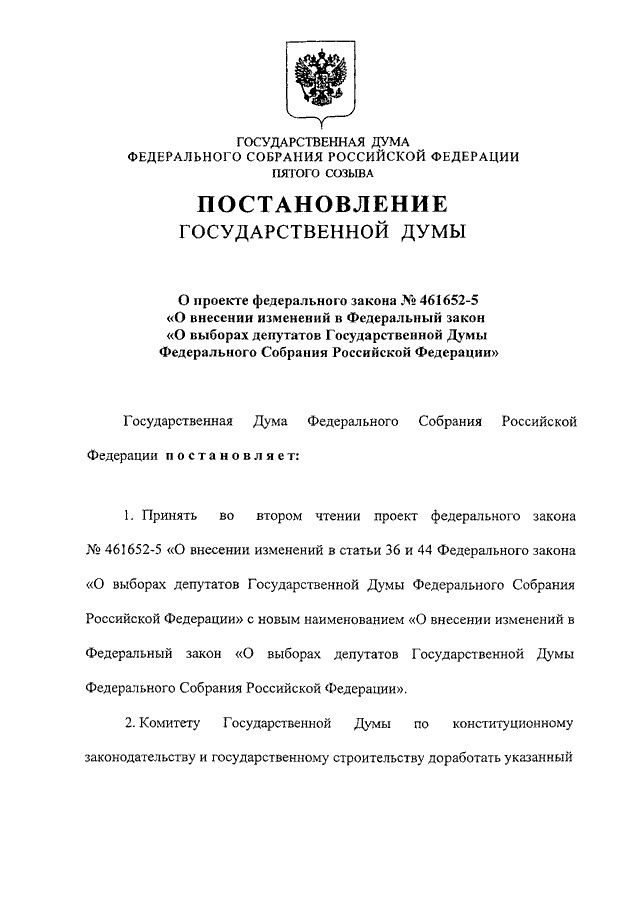 "О ПРОЕКТЕ ФЕДЕРАЛЬНОГО ЗАКОНА N 461652-5 "О ВНЕСЕНИИ ИЗМЕНЕНИЙ В ФЕДЕРАЛЬНЫЙ ЗАКОН "О ВЫБОРАХ ДЕПУТАТОВ ГОСУДАРСТВЕННОЙ ДУМЫ ФЕДЕРАЛЬНОГО СОБРАНИЯ РОССИЙСКОЙ ФЕДЕРАЦИИ"