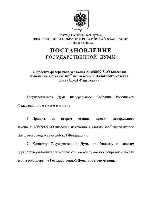 "О ПРОЕКТЕ ФЕДЕРАЛЬНОГО ЗАКОНА N 408099-5 "О ВНЕСЕНИИ ИЗМЕНЕНИЯ В СТАТЬЮ 346.29 ЧАСТИ ВТОРОЙ НАЛОГОВОГО КОДЕКСА РОССИЙСКОЙ ФЕДЕРАЦИИ"