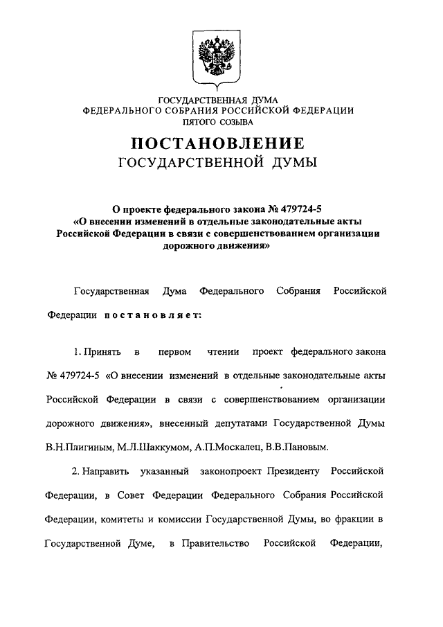"О ПРОЕКТЕ ФЕДЕРАЛЬНОГО ЗАКОНА N 479724-5 "О ВНЕСЕНИИ ИЗМЕНЕНИЙ В ОТДЕЛЬНЫЕ ЗАКОНОДАТЕЛЬНЫЕ АКТЫ РОССИЙСКОЙ ФЕДЕРАЦИИ В СВЯЗИ С СОВЕРШЕНСТВОВАНИЕМ ОРГАНИЗАЦИИ ДОРОЖНОГО ДВИЖЕНИЯ"