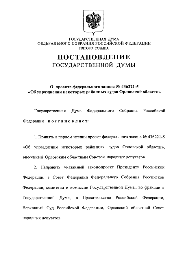 "О ПРОЕКТЕ ФЕДЕРАЛЬНОГО ЗАКОНА N 436221-5 "ОБ УПРАЗДНЕНИИ НЕКОТОРЫХ РАЙОННЫХ СУДОВ ОРЛОВСКОЙ ОБЛАСТИ"