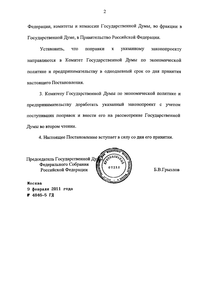 ПОСТАНОВЛЕНИЕ ГД ФС РФ от 09.02.2011 N 4846-5 ГД