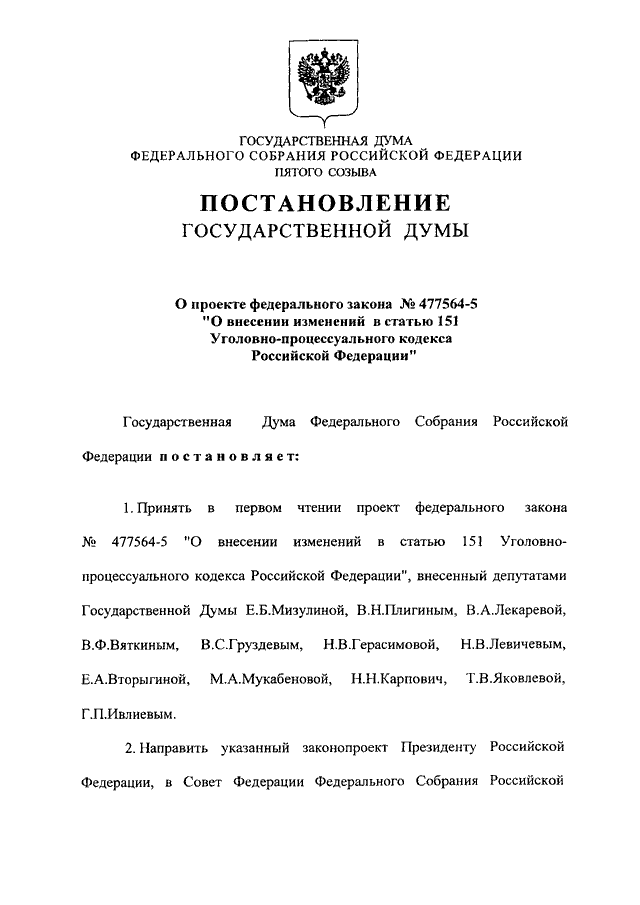 "О ПРОЕКТЕ ФЕДЕРАЛЬНОГО ЗАКОНА N 477564-5 "О ВНЕСЕНИИ ИЗМЕНЕНИЙ В СТАТЬЮ 151 УГОЛОВНО - ПРОЦЕССУАЛЬНОГО КОДЕКСА РОССИЙСКОЙ ФЕДЕРАЦИИ"