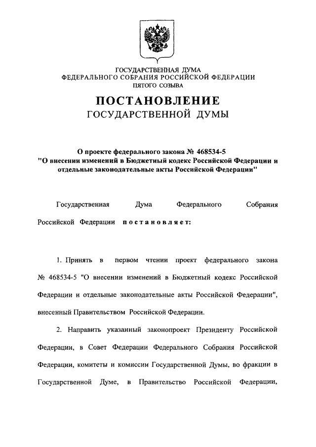 "О ПРОЕКТЕ ФЕДЕРАЛЬНОГО ЗАКОНА N 468534-5 "О ВНЕСЕНИИ ИЗМЕНЕНИЙ В БЮДЖЕТНЫЙ КОДЕКС РОССИЙСКОЙ ФЕДЕРАЦИИ И ОТДЕЛЬНЫЕ ЗАКОНОДАТЕЛЬНЫЕ АКТЫ РОССИЙСКОЙ ФЕДЕРАЦИИ"