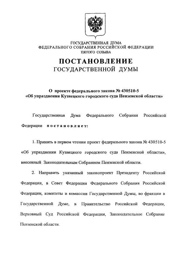 "О ПРОЕКТЕ ФЕДЕРАЛЬНОГО ЗАКОНА N 430510-5 "ОБ УПРАЗДНЕНИИ КУЗНЕЦКОГО ГОРОДСКОГО СУДА ПЕНЗЕНСКОЙ ОБЛАСТИ"