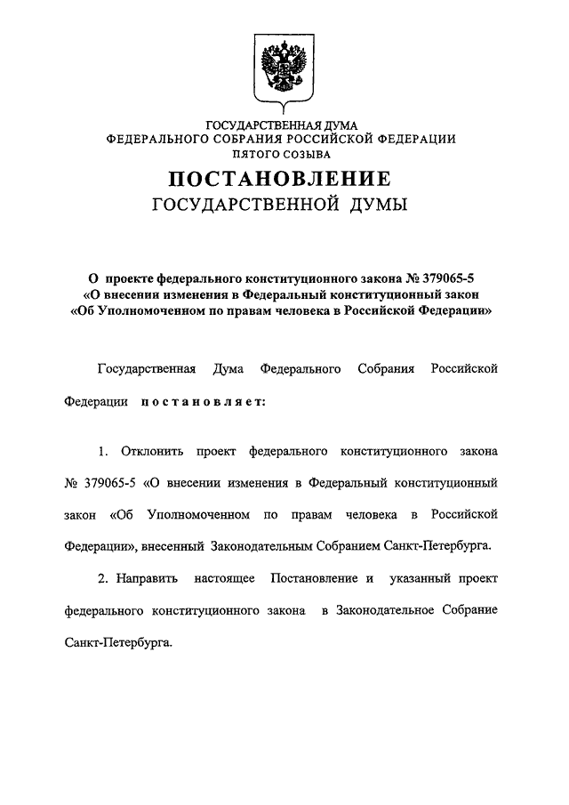 "О ПРОЕКТЕ ФЕДЕРАЛЬНОГО КОНСТИТУЦИОННОГО ЗАКОНА N 379065-5 "О ВНЕСЕНИИ ИЗМЕНЕНИЯ В ФЕДЕРАЛЬНЫЙ КОНСТИТУЦИОННЫЙ ЗАКОН "ОБ УПОЛНОМОЧЕННОМ ПО ПРАВАМ ЧЕЛОВЕКА В РОССИЙСКОЙ ФЕДЕРАЦИИ"