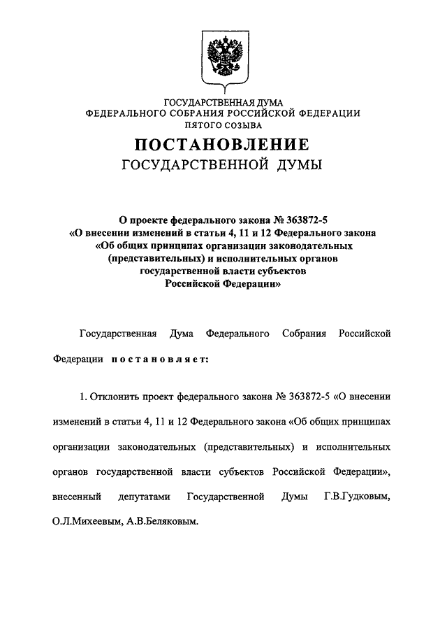 "О ПРОЕКТЕ ФЕДЕРАЛЬНОГО ЗАКОНА N 363872-5 "О ВНЕСЕНИИ ИЗМЕНЕНИЙ В СТАТЬИ 4, 11 И 12 ФЕДЕРАЛЬНОГО ЗАКОНА "ОБ ОБЩИХ ПРИНЦИПАХ ОРГАНИЗАЦИИ ЗАКОНОДАТЕЛЬНЫХ (ПРЕДСТАВИТЕЛЬНЫХ) И ИСПОЛНИТЕЛЬНЫХ ОРГАНОВ ГОСУДАРСТВЕННОЙ ВЛАСТИ СУБЪЕКТОВ РОССИЙСКОЙ ФЕДЕРАЦИИ"