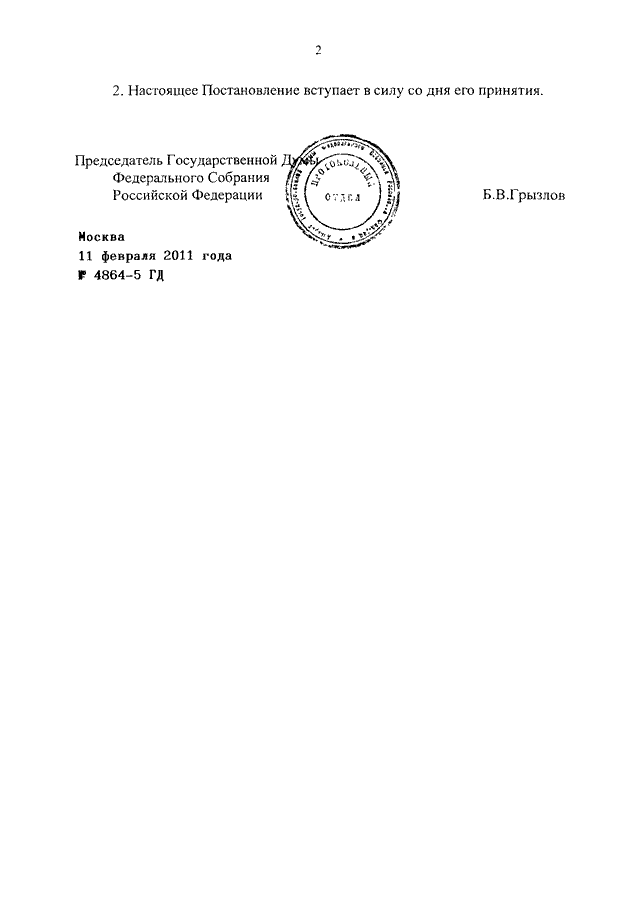 ПОСТАНОВЛЕНИЕ ГД ФС РФ от 11.02.2011 N 4864-5 ГД