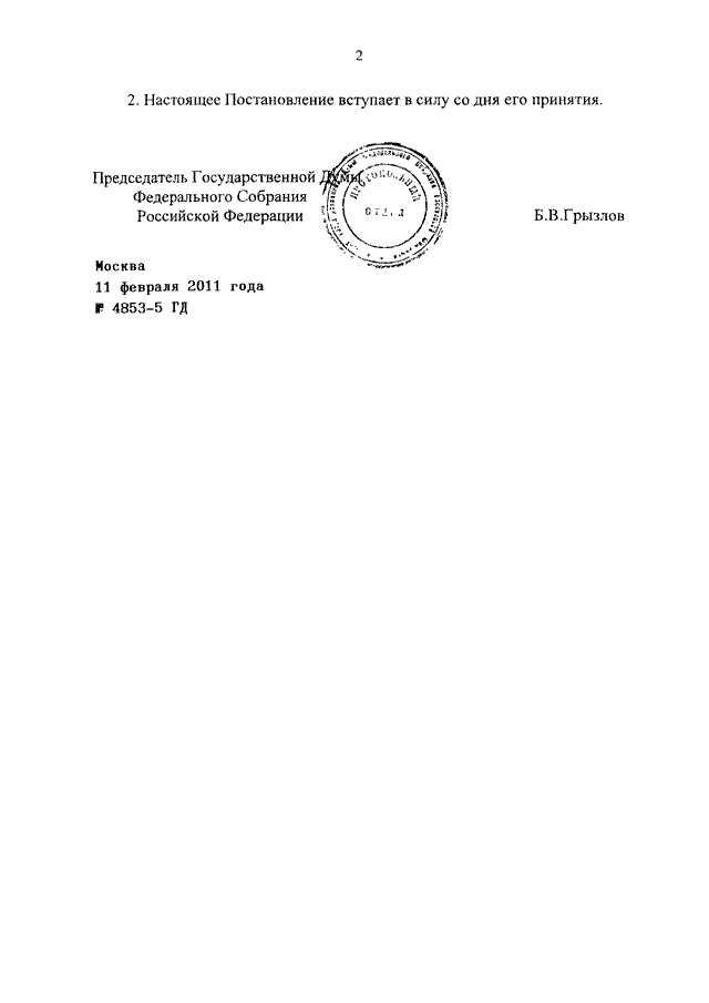 ПОСТАНОВЛЕНИЕ ГД ФС РФ от 11.02.2011 N 4853-5 ГД