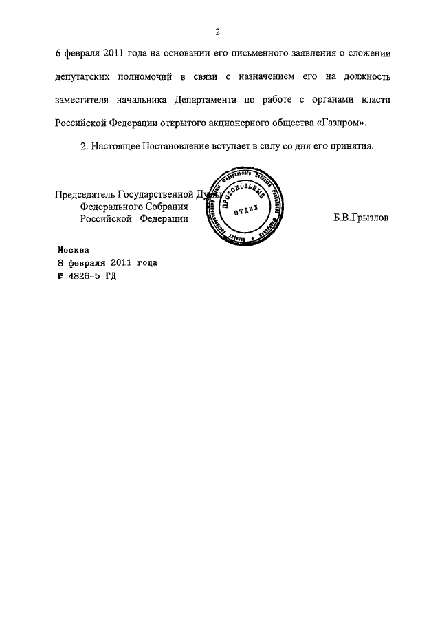 ПОСТАНОВЛЕНИЕ ГД ФС РФ от 08.02.2011 N 4826-5 ГД