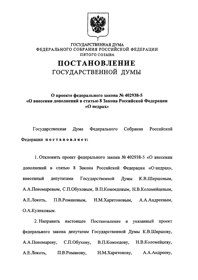 "О ПРОЕКТЕ ФЕДЕРАЛЬНОГО ЗАКОНА N 402938-5 "О ВНЕСЕНИИ ДОПОЛНЕНИЙ В СТАТЬЮ 8 ЗАКОНА РОССИЙСКОЙ ФЕДЕРАЦИИ "О НЕДРАХ"