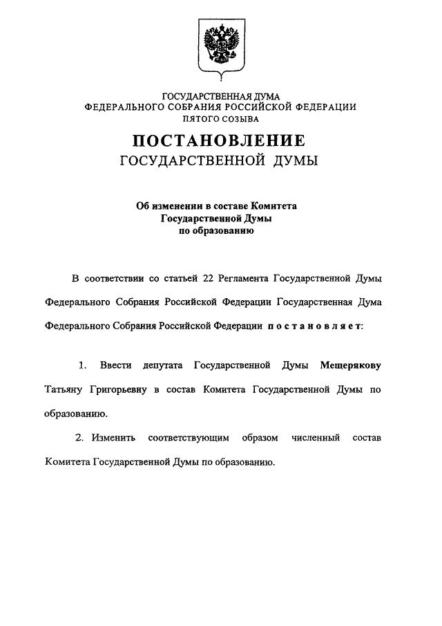 "ОБ ИЗМЕНЕНИИ В СОСТАВЕ КОМИТЕТА ГОСУДАРСТВЕННОЙ ДУМЫ ПО ОБРАЗОВАНИЮ"