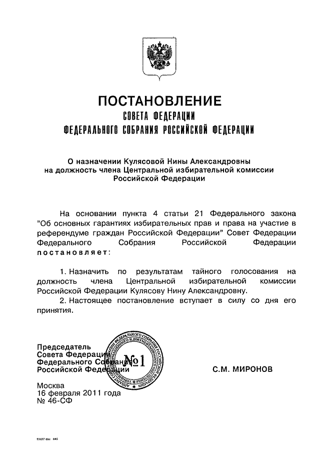 ПОСТАНОВЛЕНИЕ СФ ФС РФ от 16.02.2011 N 46-СФ