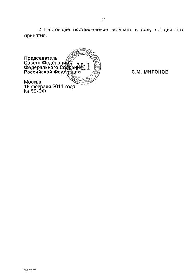 ПОСТАНОВЛЕНИЕ СФ ФС РФ от 16.02.2011 N 50-СФ