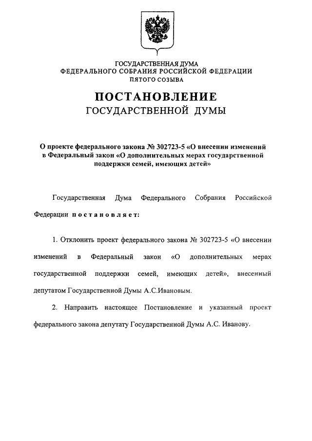 "О ПРОЕКТЕ ФЕДЕРАЛЬНОГО ЗАКОНА N 302723-5 "О ВНЕСЕНИИ ИЗМЕНЕНИЙ В ФЕДЕРАЛЬНЫЙ ЗАКОН "О ДОПОЛНИТЕЛЬНЫХ МЕРАХ ГОСУДАРСТВЕННОЙ ПОДДЕРЖКИ СЕМЕЙ, ИМЕЮЩИХ ДЕТЕЙ"