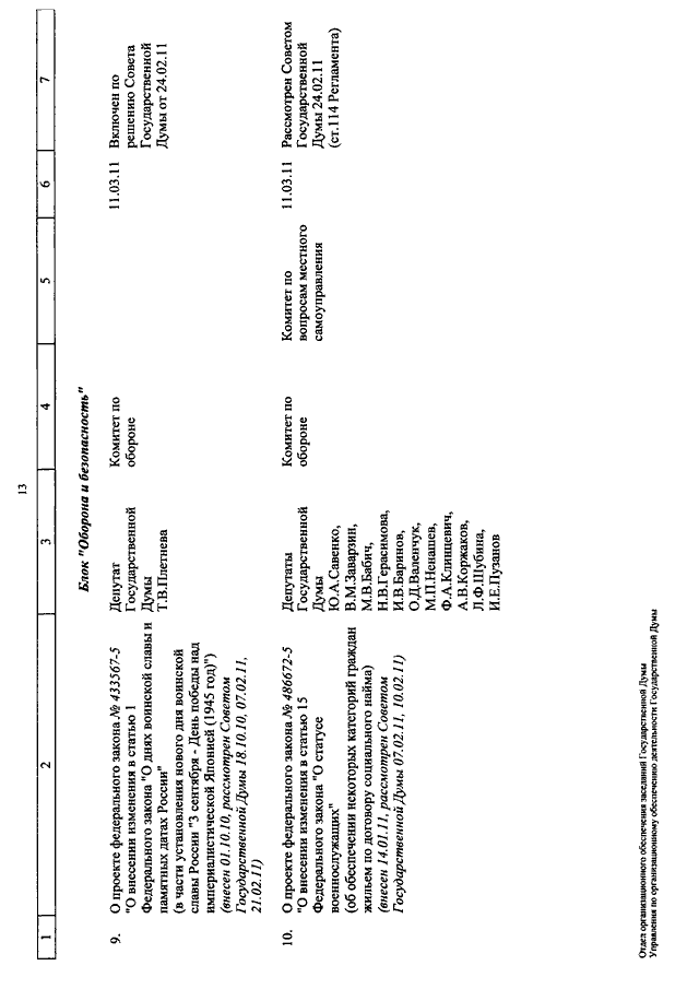 "О КАЛЕНДАРЕ РАССМОТРЕНИЯ ВОПРОСОВ ГОСУДАРСТВЕННОЙ ДУМОЙ С 9 ПО 25 МАРТА 2011 ГОДА"