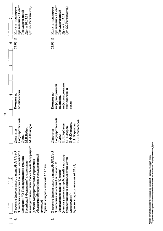 "О КАЛЕНДАРЕ РАССМОТРЕНИЯ ВОПРОСОВ ГОСУДАРСТВЕННОЙ ДУМОЙ С 9 ПО 25 МАРТА 2011 ГОДА"