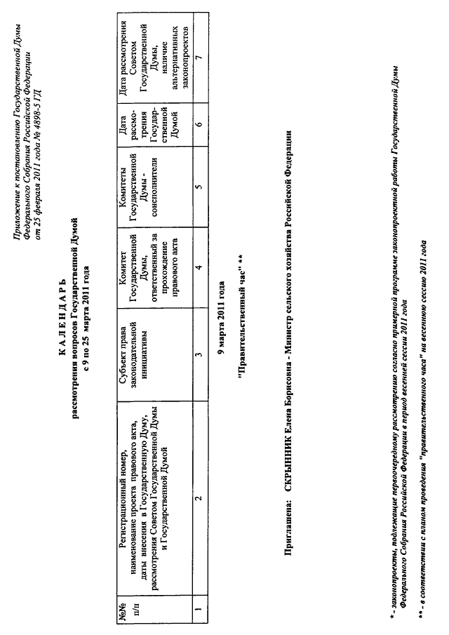 "О КАЛЕНДАРЕ РАССМОТРЕНИЯ ВОПРОСОВ ГОСУДАРСТВЕННОЙ ДУМОЙ С 9 ПО 25 МАРТА 2011 ГОДА"