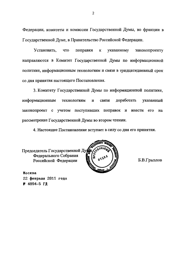 ПОСТАНОВЛЕНИЕ ГД ФС РФ от 22.02.2011 N 4894-5 ГД