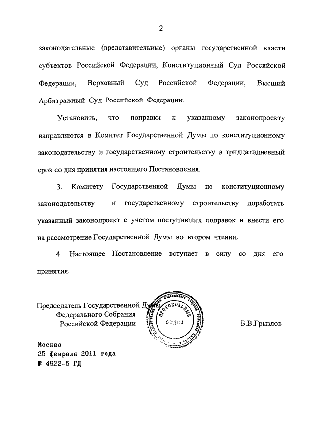 ПОСТАНОВЛЕНИЕ ГД ФС РФ от 25.02.2011 N 4922-5 ГД