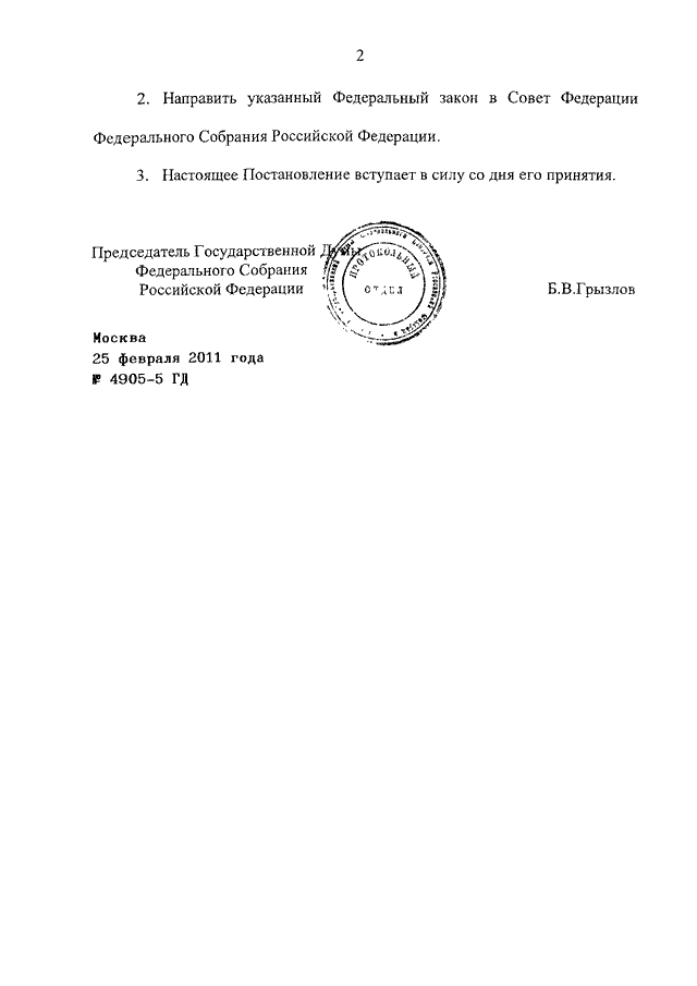 ПОСТАНОВЛЕНИЕ ГД ФС РФ от 25.02.2011 N 4905-5 ГД
