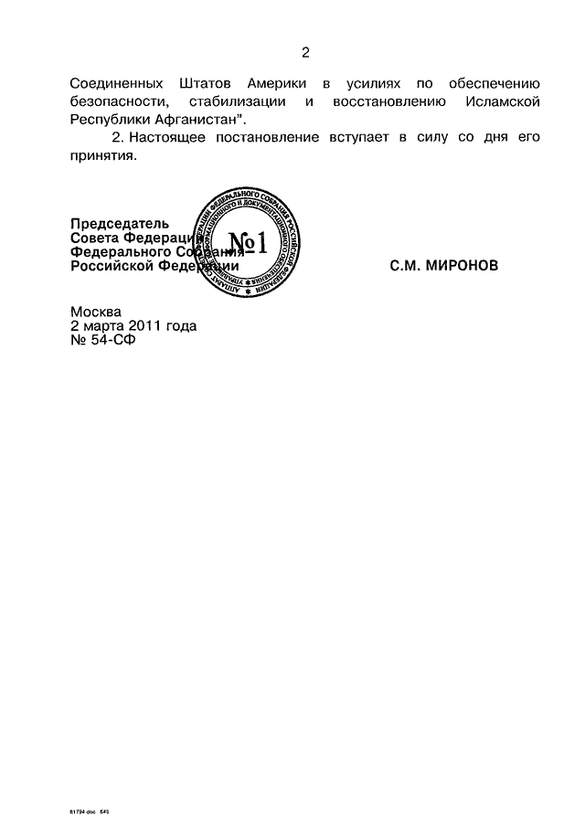 ПОСТАНОВЛЕНИЕ СФ ФС РФ от 02.03.2011 N 54-СФ