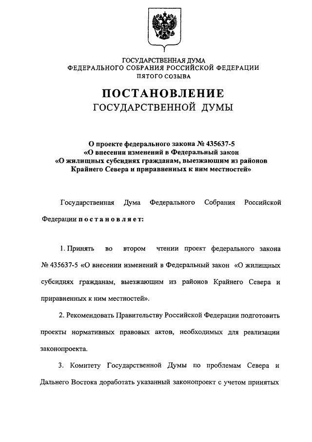 "О ПРОЕКТЕ ФЕДЕРАЛЬНОГО ЗАКОНА N 435637-5 "О ВНЕСЕНИИ ИЗМЕНЕНИЙ В ФЕДЕРАЛЬНЫЙ ЗАКОН "О ЖИЛИЩНЫХ СУБСИДИЯХ ГРАЖДАНАМ, ВЫЕЗЖАЮЩИМ ИЗ РАЙОНОВ КРАЙНЕГО СЕВЕРА И ПРИРАВНЕННЫХ К НИМ МЕСТНОСТЕЙ"