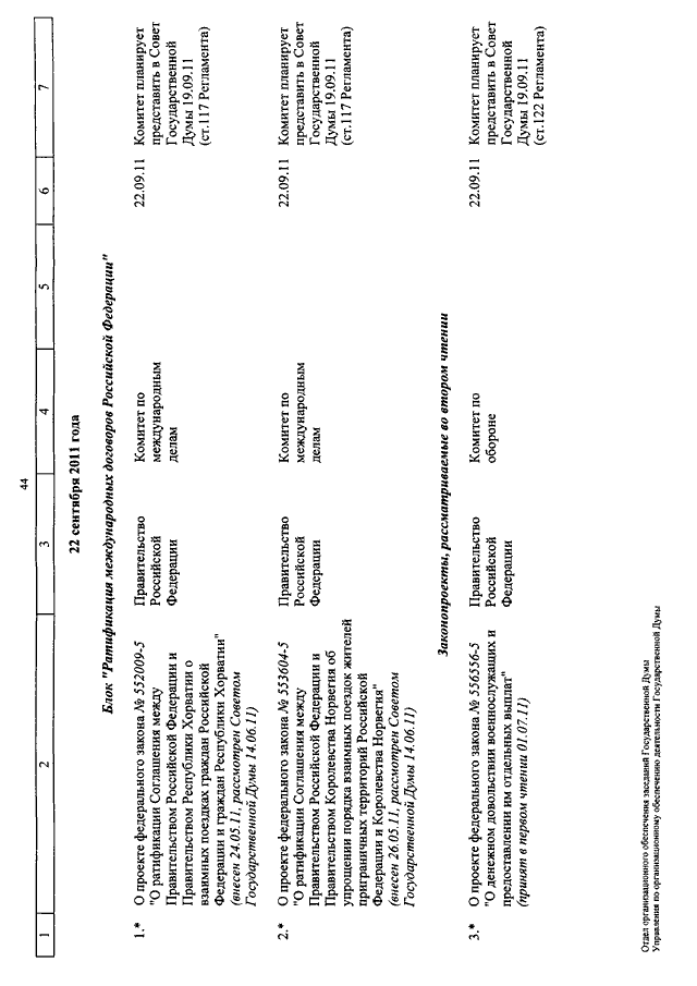 "О КАЛЕНДАРЕ РАССМОТРЕНИЯ ВОПРОСОВ ГОСУДАРСТВЕННОЙ ДУМОЙ С 6 ПО 22 СЕНТЯБРЯ 2011 ГОДА"