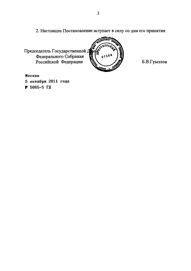 ПОСТАНОВЛЕНИЕ ГД ФС РФ от 05.10.2011 N 5865-5 ГД