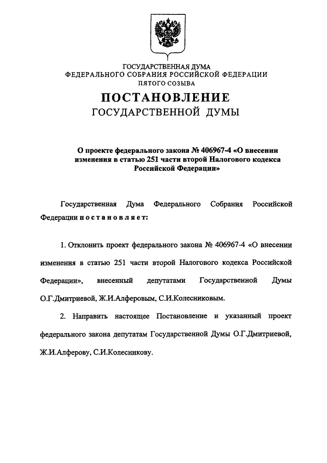 "О ПРОЕКТЕ ФЕДЕРАЛЬНОГО ЗАКОНА N 406967-4 "О ВНЕСЕНИИ ИЗМЕНЕНИЯ В СТАТЬЮ 251 ЧАСТИ ВТОРОЙ НАЛОГОВОГО КОДЕКСА РОССИЙСКОЙ ФЕДЕРАЦИИ"