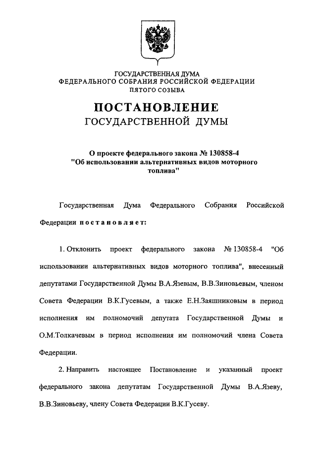 "О ПРОЕКТЕ ФЕДЕРАЛЬНОГО ЗАКОНА N 130858-4 "ОБ ИСПОЛЬЗОВАНИИ АЛЬТЕРНАТИВНЫХ ВИДОВ МОТОРНОГО ТОПЛИВА"