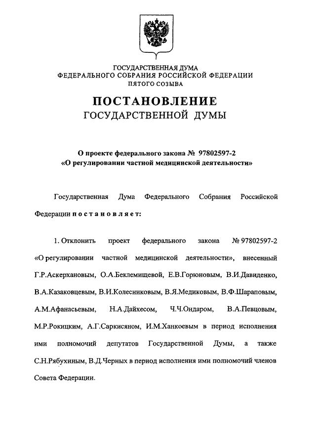 "О ПРОЕКТЕ ФЕДЕРАЛЬНОГО ЗАКОНА N 97802597-2 "О РЕГУЛИРОВАНИИ ЧАСТНОЙ МЕДИЦИНСКОЙ ДЕЯТЕЛЬНОСТИ"